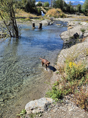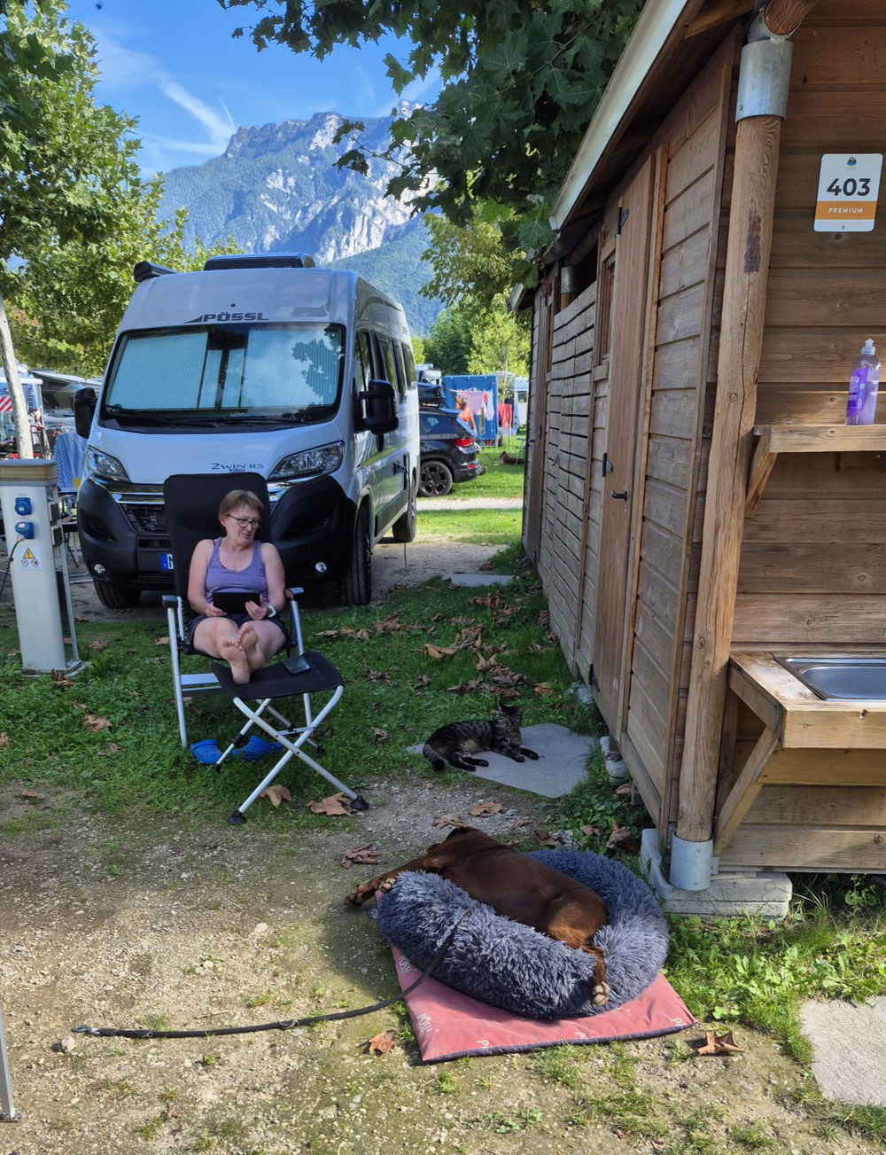 Wir haben einen sehr schönen Stellplatz bekommen! Leider ist es immer noch regnerisch, so konnten wir nur eine kurze Gasi-Runde mit Fritzi gehen und sonst haben wir unter der Markise gesessen!