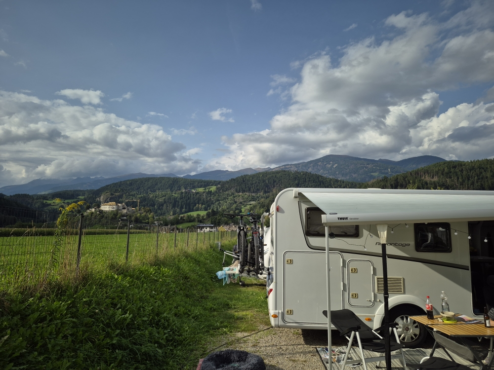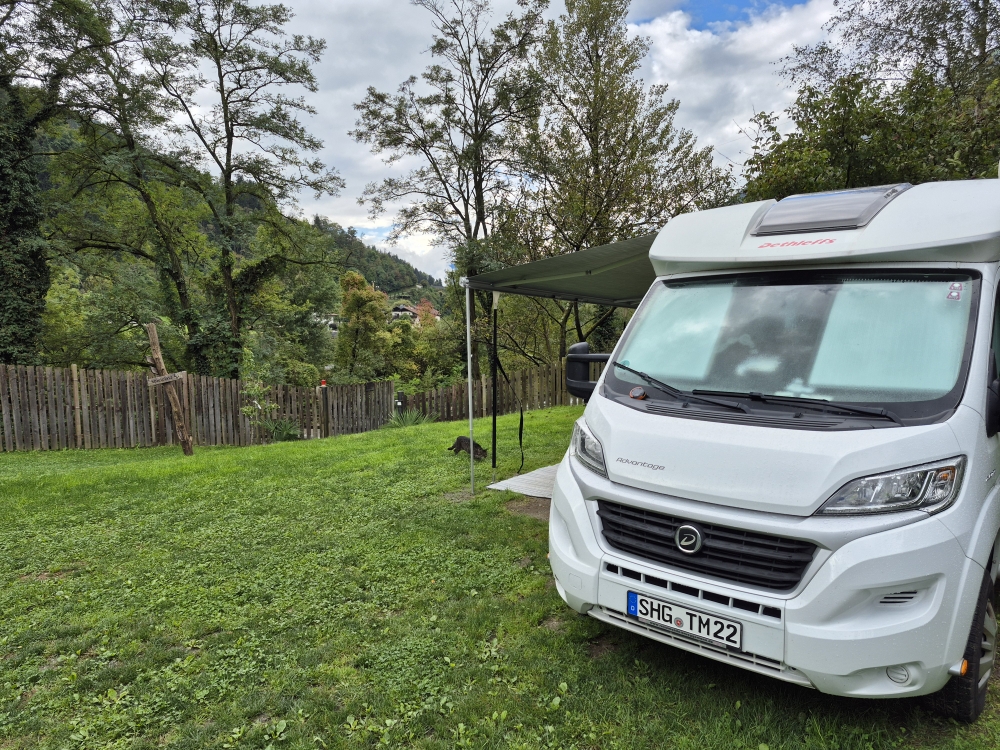 Unser nächstes Ziel ist wieder ein bekannter Platz. Wir fahren zum Radlstadl Camping. Der Campingplatz liegt 10 KM von Meran entfernt, direkt am Fluss Passer.