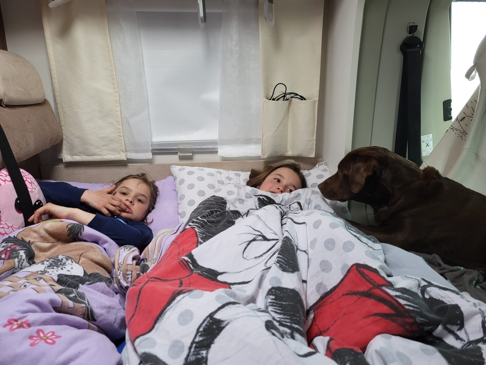 Wir sind pünktlich um 6 Uhr gestartet und haben die Kids abgeholt.  Unser WoMo ist bis oben hin vollgepackt.