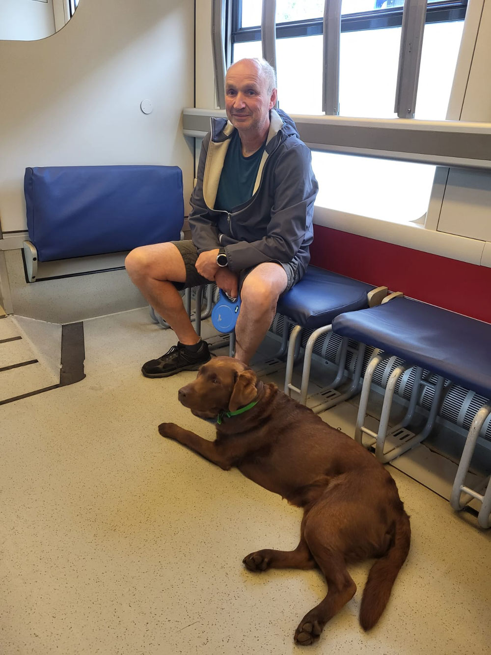 Fritzi macht das Fahren mit dem Zug 🚆 wenig aus! Sie liegt entspannt im Gang.