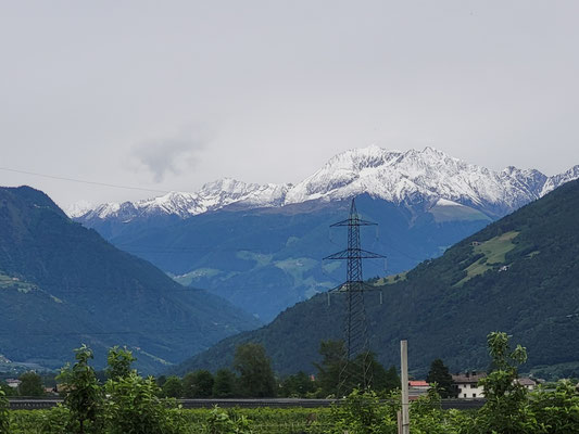 Über den Fernpass und Reschenpass sind wir gut angekommen! Unser Stellplatz ist einfach spitze. Wir haben eine schöne Aussicht über die Apfel-Plantagen und auf die Berge