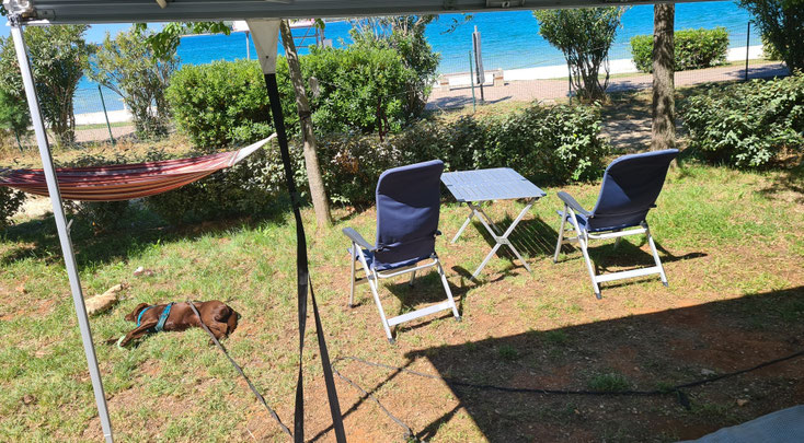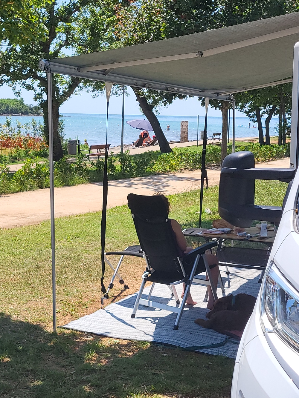 Wir hatten uns als Ziel den Campingpark Umag ausgesucht! Wir waren vor Jahren schon einmal auf diesen schönen Campingplatz und kennen uns deshalb schon aus. Wir wollten kein Risiko wegen unserer Katze eingehen. Als wir dort angekommen sind, hatten der Campingplatz ein Computer Problem! Wir sind deshalb auf den in unmittelbarer Nähe liegenden Campingplatz Finida gefahren. Dort angekommen haben wir einen schönen Stellplatz mit Meerblick bekommen.